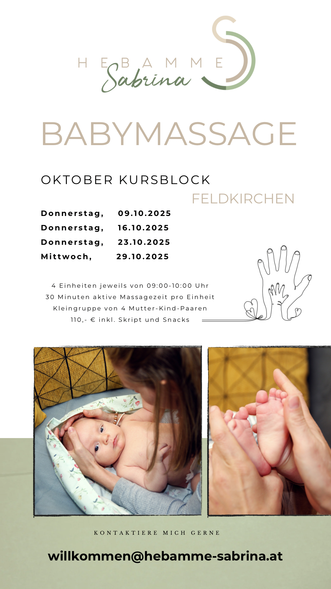 Ich biete ebenso laufend Babymassage Kurse in Kleingruppen (max. 4 Mutter-Kind-Paare) in meiner Hebammenordination an.